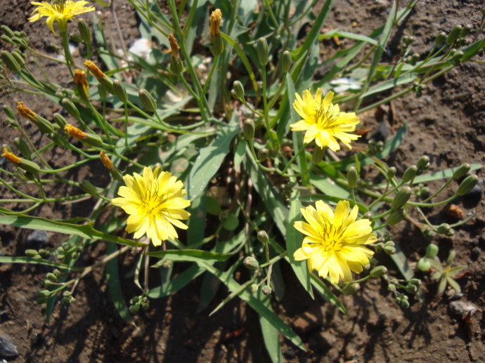 原生形態(tài):抱莖苦荬菜多年生草本,高可達(dá)1米許。根粗壯而垂直。莖直立。根生葉排成蓮座狀,葉片長(zhǎng)圓狀倒披針形,倒向羽裂狀或羽狀缺刻,先端短尖或鈍圓,基部慚狹成柄,花期通常不萎落;莖生葉基部抱莖。頭狀花序排成傘房狀;總苞圓摘狀,外層苞片極短小,內(nèi)層苞片線狀披針形;花黃色,全部為舌狀花,先端5齒裂;花柱細(xì)長(zhǎng),柱頭2裂,冠毛白色,一層。瘦果紡錘形,稍扁,果喙長(zhǎng)約為瘦果的1/4,通常與瘦果不同色。花期春季。生于山腳、路邊、疏林內(nèi)、河邊。