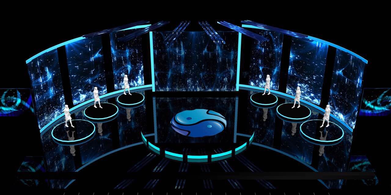 答:舞美設(shè)計(jì)是最直觀的表現(xiàn)。常規(guī)的舞美設(shè)計(jì)里,舞臺(tái)是有主持人區(qū)的,也就是舞臺(tái)中心;但這次舞臺(tái)沒(méi)有中心,大象融媒的六大媒介矩陣各居一方,分布在舞臺(tái)的六個(gè)維度上,體現(xiàn)融合之道!但僅是去除中心最直觀的表現(xiàn),不是唯一的表現(xiàn)。