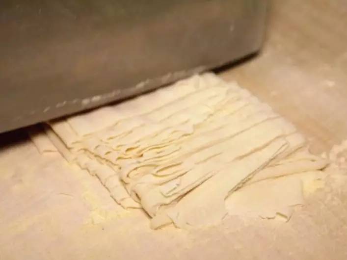 高筋面粉來和面,用搟面杖反復(fù)搟二十多分鐘,直到面餅微薄透光。這樣做出的面條,經(jīng)過煮制后口感才會筋道軟滑。
