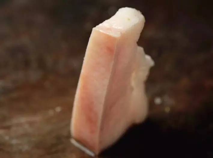 與常見的肥肉不同,黑豬肉肉質(zhì)十分緊實(shí),隨手切下來一塊放在桌子上就能直立起來不會塌架的。肉皮十分緊致,用手怎么捏都不會變形。