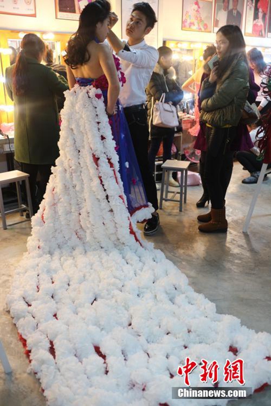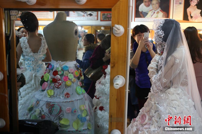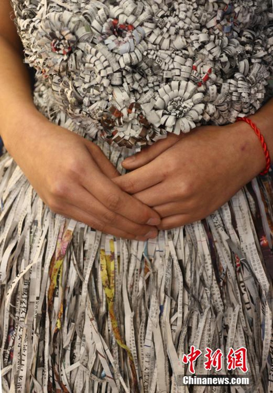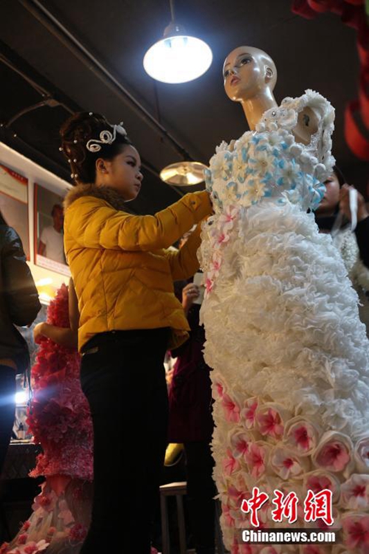 1月12日,成都職業(yè)技術(shù)學(xué)院數(shù)十名大學(xué)生將自己設(shè)計的期末作品——紙婚紗穿上展示,這些作品都是經(jīng)過數(shù)天時間手工制作而成,以報紙、衛(wèi)生紙、成績單等作為原材料,大學(xué)生在完成個性化的婚紗定制的同時還倡行了廢物利用的環(huán)保理念。圖為大學(xué)生穿上自己的紙婚紗作品。 張浪 攝