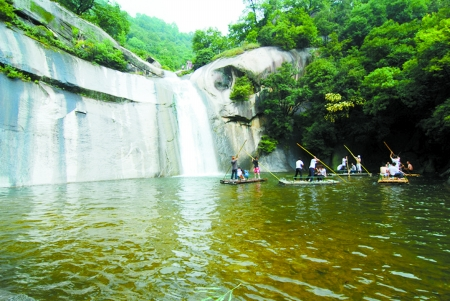 龍?zhí)稖仙角逅?,石奇崖險(xiǎn),頗具登臨之趣。整個(gè)峽谷兩側(cè)是花崗巖山體,一色的蒼青如黛,更顯巨石秀姿。大龍?zhí)陡浇囊粔K巨石酷似鱷魚(yú)頭,正伸入水中飲水,游人稱之為“鱷魚(yú)戲水”;“四連瀑”附近有塊巨石更是神奇,從對(duì)面山頭看,猶如豬八戒的頭,像是伸出水面偷看龍女洗澡,人們稱之為“八戒窺浴”;從后面看又酷似船頭,因此又叫“船石”;黑龍?zhí)杜赃呌腥龡l極像鯊魚(yú)的巨石,魚(yú)頭伸向潭水,美其名曰“三鯊鬧龍?zhí)丁?。此外,還有“絕壁掛雪”、“神龜過(guò)江”、“鯉魚(yú)跳龍門(mén)”等。奇石遍布,形態(tài)各異,惟妙惟肖,渾然天成。