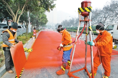 “機(jī)動(dòng)車道6米寬,鋪設(shè)‘綠道’的自行車道也為6米寬。看慣了灰黑色的路面,在看到色彩明銳的‘綠道’后肯定覺得眼前一亮?!G道’只是叫法,并不是說道路外觀一定是綠色的,在景觀設(shè)計(jì)中,‘綠道’往往有著更深更廣的內(nèi)涵?!惫こ特?fù)責(zé)人呂先生告訴記者,彩色瀝青厚度僅為1到2毫米,壽命在5年以上,具有警示、防滑、降噪、美觀等特點(diǎn)?!拔覈?guó)‘綠道’通常以警示色紅色為主打,主要作用是打造人車分離模式,供騎車者和步行者休閑使用。”